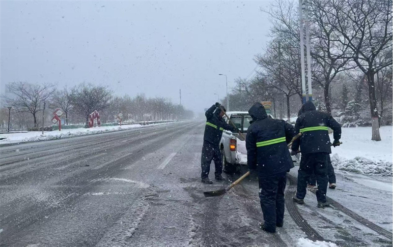 降雪后,按照“雪隨下隨清”的原則,待命隊(duì)員迅速行動,在包保路段通過滾刷鏟雪、撒布融雪劑、人工清掃等方式循環(huán)作業(yè),高效開展除雪工作。